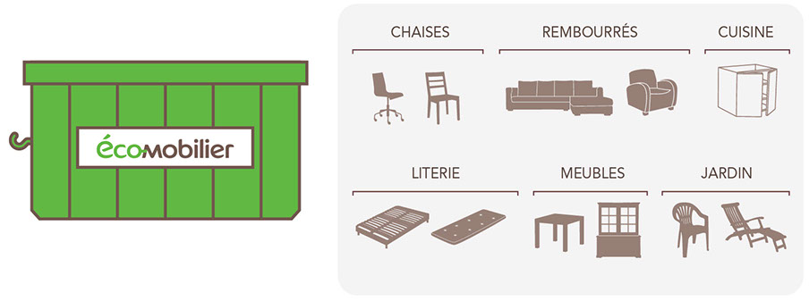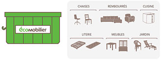 Les bennes "éco-mobilier" seront destinées à recevoir le mobilier hors d’état d’usage, de préférence démonté : chaises, canapés, fauteuils, éléments de cuisines, literie, armoires, meubles de jardin, etc. Attention ! Les éléments de décoration, de "récréation "(poussettes, sièges enfants, jeux…), ou sanitaires ne sont pas destinés aux bennes "éco-mobilier".